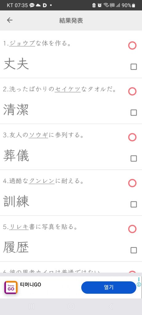 불금 김 인화2026/04/10 7:42 오전불금에 1개 댓글 <span class="nav-subtitle screen-reader-text">Page</span> Previous Post로봇이 친숙한 존재가 되다Next Post친환경적이다 One Comment せいけつ [清潔] 1. 청결2. 더럽지 않음3. 깨끗함 발음 예문 열기 명사, ダナ복합어관련 한자요미가나 같은 단어 명사, ダナ 1. 청결; 더럽지 않음; 깨끗함. 清潔せいけつな台所だいどころ 청결한 부엌[주방] 반의어 不潔 답글을 남기기 위해 로그인하기 답글 남기기 응답 취소댓글을 달기 위해서는 로그인해야합니다.