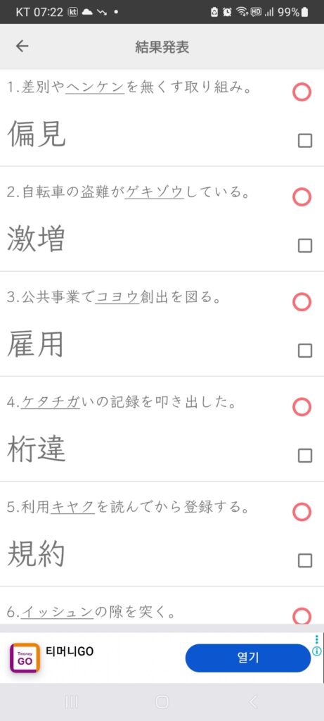 수요일 김 인화2026/04/08 7:25 오전2026/04/08 7:25 오전수요일에 1개 댓글 <span class="nav-subtitle screen-reader-text">Page</span> Previous Post버스로 대체운행하다Next Post~을 밑돌다 One Comment けたちがい [けた違い·桁違い] 1. 현격한 차이;단위가 틀림2. 숫자의 자릿수가 틀림;→けた2 발음 악센트 3음절 강조 けたちがい 예문 열기 ダナノ명사관련 한자 ダナノ 1. 현격한 차이; 단위가 틀림. けた違ちがいのスケール 월등한 차이가 나는 스케일 명사 1. 숫자의 자릿수가 틀림. 답글을 남기기 위해 로그인하기 답글 남기기 응답 취소댓글을 달기 위해서는 로그인해야합니다.