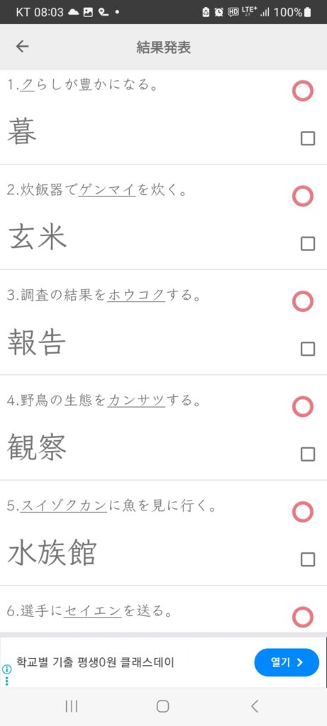 일요일 김 인화2025/10/26 8:17 오전일요일에 1개 댓글 <span class="nav-subtitle screen-reader-text">Page</span> Previous Post나무를 가지치기하다(복습)Next Post풀을 뽑다(복습) One Comment かんさつ [観察] 관찰, 사물이나 현상을 자세히 살펴보는 것. 출처: 민중서림 엣센스 일한사전 관련 한자 観 볼 관 부수 見 총획 18획 음독 かん 察 살필 찰 부수 宀 총획 14획 음독 さつ 답글을 남기기 위해 로그인하기 답글 남기기 응답 취소댓글을 달기 위해서는 로그인해야합니다.