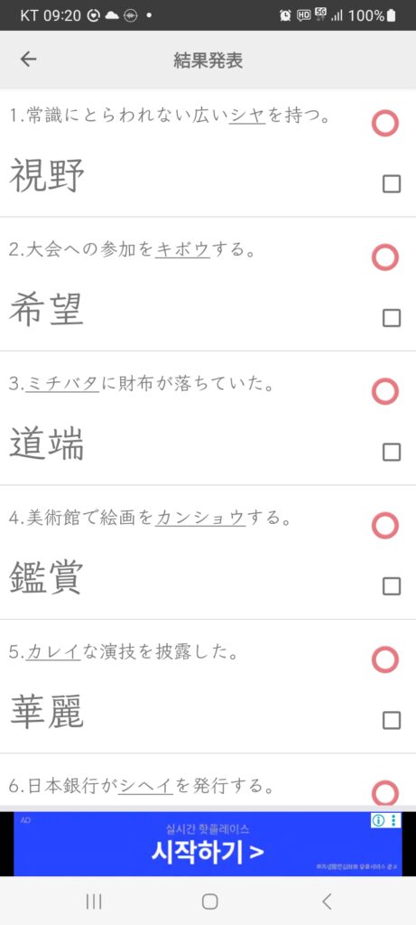일요일 김 인화2025/09/07 9:24 오전일요일에 2개 댓글 <span class="nav-subtitle screen-reader-text">Page</span> Previous Post주저리주저리 말하다(복습)Next Post깊이 빠져들다(복습) 2 Comments かんしょう [鑑賞] 감상, 예술 작품을 즐기고 이해하는 것. 出処: エッセンス 日韓辞典-民衆書林 관련 한자 鑑 거울 감 부수 金 총획 23획 음독 かん 훈독 かんがみる 賞 상줄 상 부수 貝 총획 15획 음독 しょう 답글을 남기기 위해 로그인하기 かんそう [感想] 감상, 마음에 떠오르는 느낌이나 생각. (=所感, 感懐) 出処: エッセンス 日韓辞典-民衆書林 관련 한자 感 느낄 감 부수 心 총획 13획 음독 かん 想 생각 상 부수 心 총획 13획 음독 そう·そ 답글을 남기기 위해 로그인하기 답글 남기기 응답 취소댓글을 달기 위해서는 로그인해야합니다.