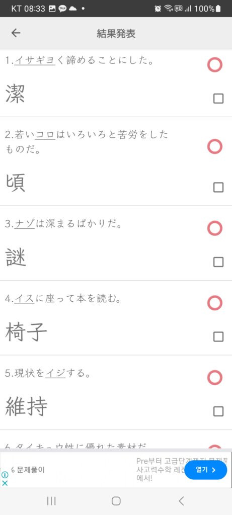JLPT N1 いさぎよい [潔い] 1. 깨끗하다2. 결백하다 발음 미연형 潔いさぎよかろう 부정형 潔いさぎよくない て형 潔いさぎよくて 과거형 潔いさぎよかった 가정형 潔いさぎよければ 정중형 潔いさぎよいです더보기 악센트 4음절 강조 いさぎよい 예문 열기 형용사관련 한자 형용사 1. (비겁한 데나 미련이 없이) 깨끗하다. 潔いさぎよく負まけ[選挙せんきょ結果けっか]を認みとめる 깨끗하게 패배[선거 결과]를 인정하다 2. 결백하다; 떳떳하다; 꺼림칙한 데가 없다. 潔いさぎよい態度たいど 떳떳한 태도 답글을 남기기 위해 로그인하기