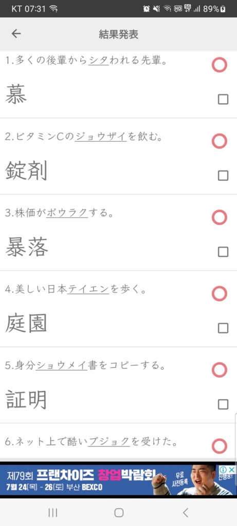 토요일 김 인화2025/06/07 7:37 오전토요일에 1개 댓글 <span class="nav-subtitle screen-reader-text">Page</span> Previous Post땀이나는 날씨가되다(복습)Next Post탕감하다(복습) One Comment 慕 音読み ぼ 訓読み したう 部首 心 (4획) 総画 14画 韓国漢字 慕 (그릴 모) 例文を開く 1. 그리워하다; 사모하다. 慕情ぼじょう 모정 답글을 남기기 위해 로그인하기 답글 남기기 응답 취소댓글을 달기 위해서는 로그인해야합니다.