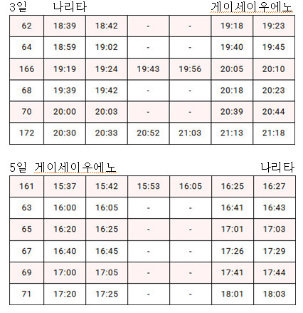 (3일은 19:39 나리타 출발, 5일은 16:20 우에노출발 예상)