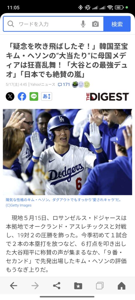 오타니와 같은팀에 있는 한국인 타자 활약에 대한 일본의 반응입니다. 제목부터 안익숙한 단어들로 시작하네요. (9번 타자로서 너무 잘 쳤고 한국언론들이 난리다 이런내용이입니다. 약간 얕보는듯한 느낌도 살짝 드네요.)